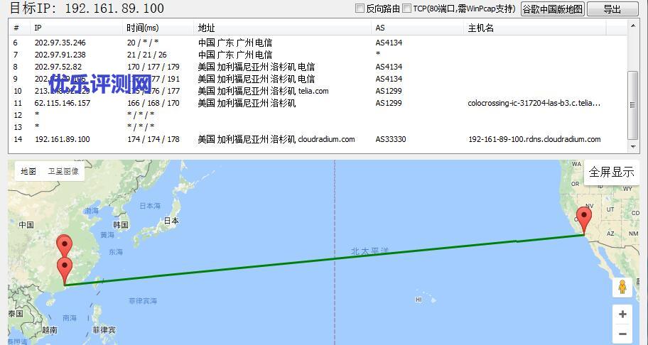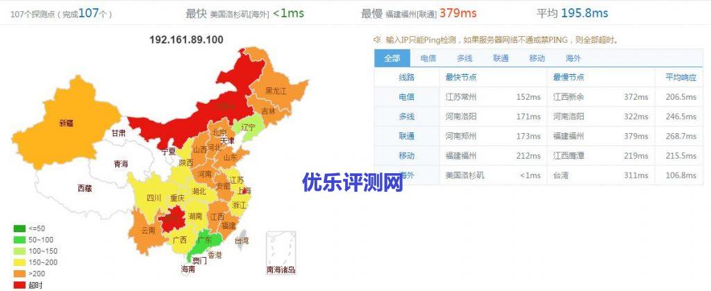 美国洛杉矶机房国内访问速度还算不错,平均ping值在200MS左右。其中中国电信访问基本是在160MS左右,移动联通稍差在200MS以上。路由追踪显示中国大陆直连。测试IP:192.161.89.100。