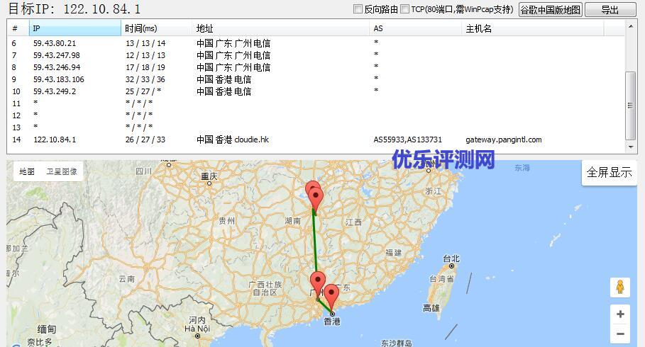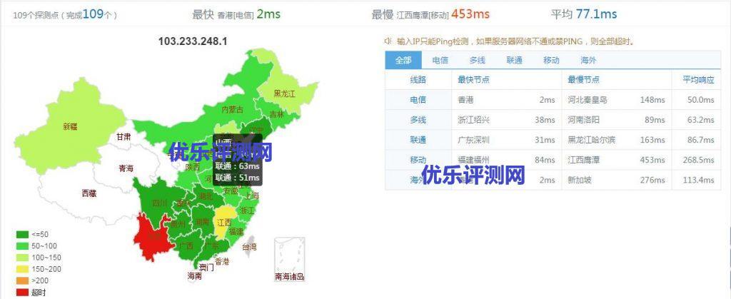 香港Sun新网络机房国内访问平均ping值在80MS以内,电信、移动、联通访问速度都还不错,ping值基本都是70MS左右,其中电信速度比移动联通稍好。路由追踪显示大陆直连。测试IP:103.233.248.1。