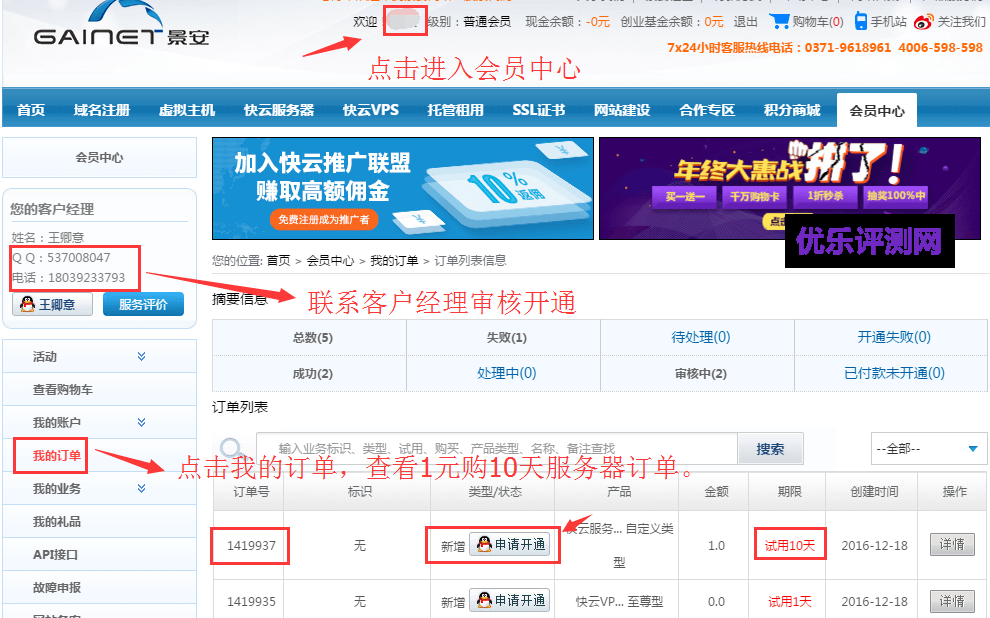 4.订单完成后,点击点击进入景安网络官网回到首页,然后点击最上面红框位置自己的名字进入到会员中心。点击“我的订单”可以查看到刚才购买的1元10天快云服务器体验,需要联系客户经理开通。客户经理的联系方式在左上角。客户经理周六、日不上班。