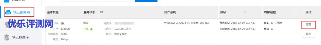 6、系统重装。新开通的主机选择的是Windows 2008未激活系统,如果你要重装系统,点击服务器后面的“管理”进入到服务器管理页面