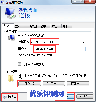 在远程桌面连接窗口点击“选项”,输入你主机的IP和用户名,点击保存,方便下次连接。输入好后点击“连接”按钮。