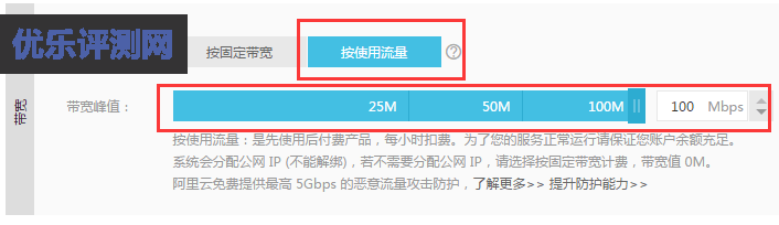 4、在宽带使用方式方面,如果你所消耗的流量不是很大,建议你使用“按使用流量”收费,这样我们可以选择最大的100Mbps带宽,流量价格是0.72元/GB,但我们站点流量高起来的时候再选择固定宽带。如果你一开始消耗流量很大就建议选择“按固定宽带”。