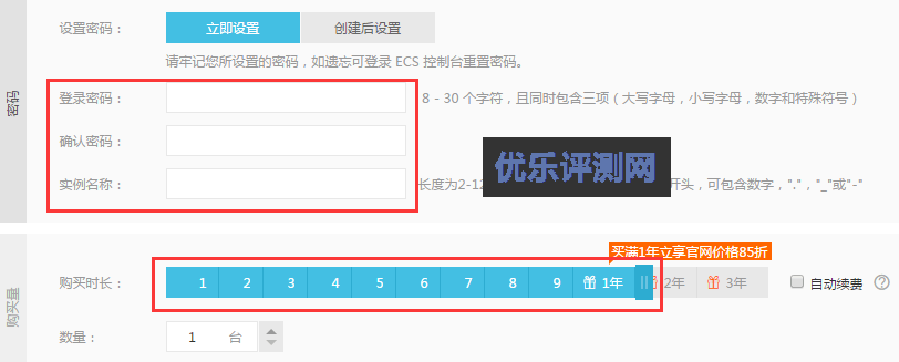 7、接下来就是设置服务器登陆密码和购买周期。购买周期大家根据自己需要选择,建议年付,因为年付有85折优惠,价格最低只需416元左右(不含宽带使用量),月付价格是40元/月(不含宽带使用量)。这里设置密码和名称需要登录阿里云账号后才能设置。如果你是新阿里云用户注账号可领取优惠券。
