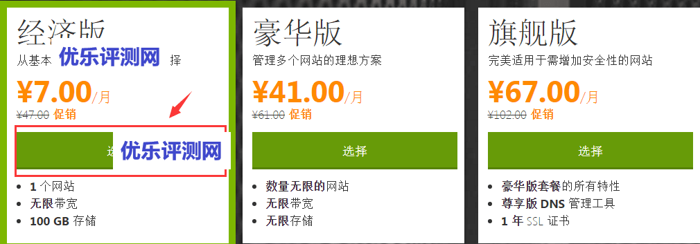 1、使用上面的优惠链接进入GoDaddy虚拟主机购买页面,选择你需要的主机套餐。蜗牛选择的是经济版。