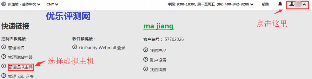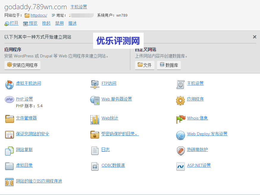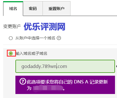 3、可以选择绑定自己域名和从GoDaddy账号中选择一个域名。蜗牛789选择的是绑定自己二级域名。在设置里点“重置账户”可以恢复虚拟主机到初始状态。