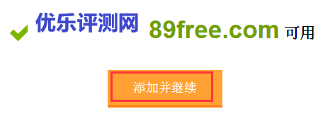 3、如果你注册的域名可以注册就点击“添加并继续”,如果已被注册就更换域名从新注册。