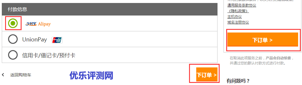 4、填写购买者信息,选择支付宝付款,点击页面下面的“下订单”确认,然后再点右侧“下订单”按钮进入支付宝付款页面。完成付款即可。