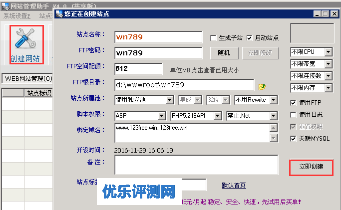 4、全部安装完成后点击“创建网站”来建立自己站点。网站创建成功后,我们就使用FTP上传站点文件、到域名管理页面给域名添加解析。