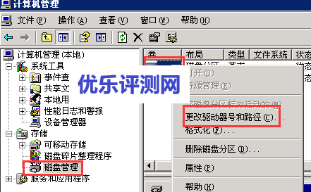然后点击“磁盘管理”,再右键点击未设置磁盘号的磁盘,选择“更改驱动器号和路径”。