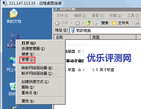 4、连接远程桌面后,有点服务器D盘没有显示出来,请右键点击“我的电脑”,选择“管理”选项。
