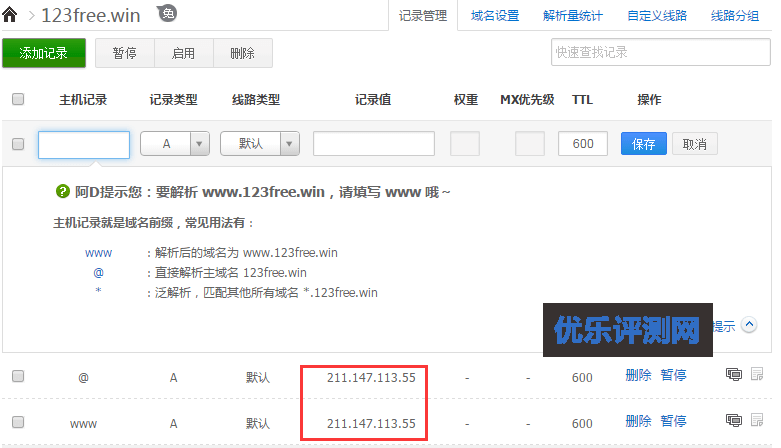 5、网站创建成功后到你的域名管理添加解析记录。如果你不会域名解析请查看:免费域名解析教程。当然如果你没有域名,本站也有实惠域名推荐。