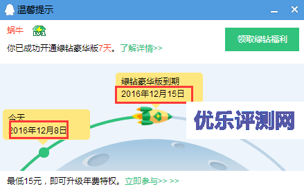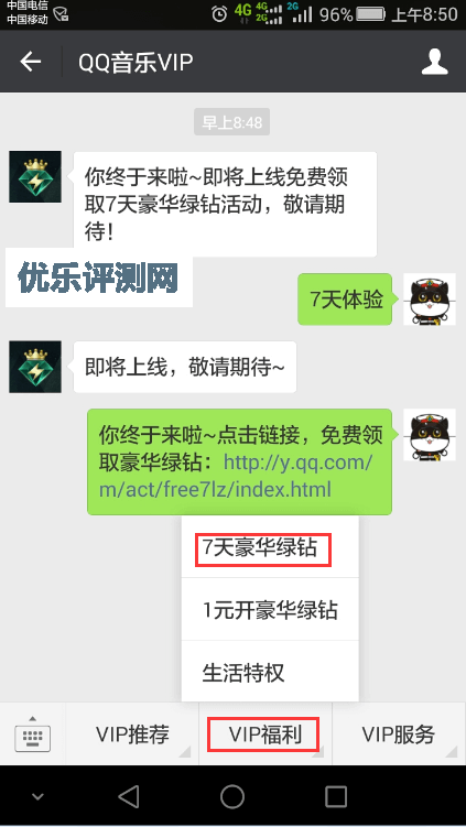 2、关注微信号后点击“VIP福利”、“7天豪华绿钻”,或直接回复“7天体验”。然后点击“立即领取”,填写自己QQ号即可领取成功。虽然目前提示提示活动即将上线,但是蜗牛今天早上还是领取成功了,每天10000个名额,请尽快领取。