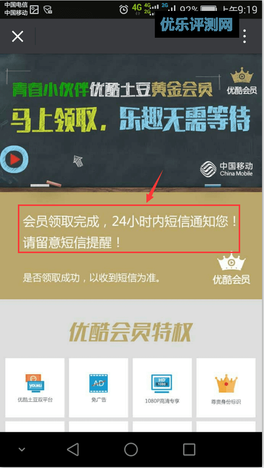 输入手机号领7天优酷土豆黄金会员活动介绍: 1、参与对象:全体手机用户及优酷土豆新老用户 2、活动限制:领取会员的手机号要绑定已有优酷土豆账号 3、参与方式:进入活动页面,填写手机号码即可领取(无门槛) 4、活动时间:截止时间未知(请尽快参与) 输入手机号领7天优酷土豆黄金会员参与流程: 1.手机扫描下面二维码进入到活动页面。 2、进入活动页面后输入自己手机号码点击“立即领取”。稍等片刻就会提示领取成功。