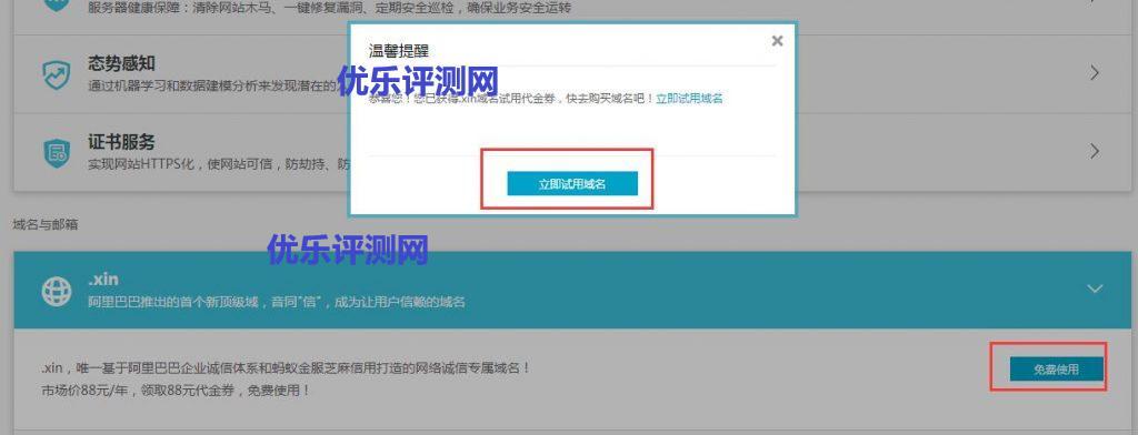 1、关于获取免费使用资格,请参照【阿里云】新注册用户免费领取6个月1核2G内存云服务器教程中“阿里云免费云服务器ECS领取及管理教程”的前1-4步骤。然后找到域名与邮箱栏,在.xin域名栏点击“免费使用”