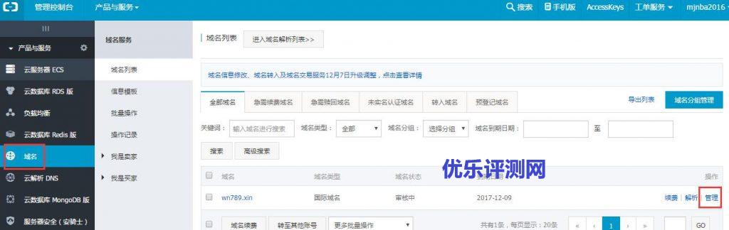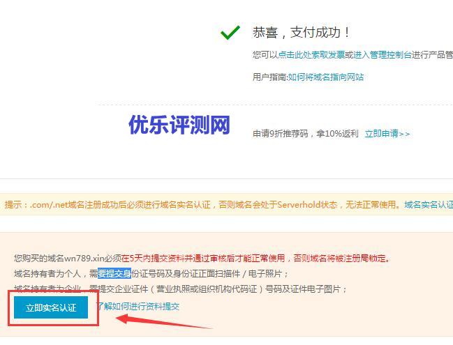 6、付款成功后请按流程完成域名实名认证。关于如何认证蜗牛就不做教程了。