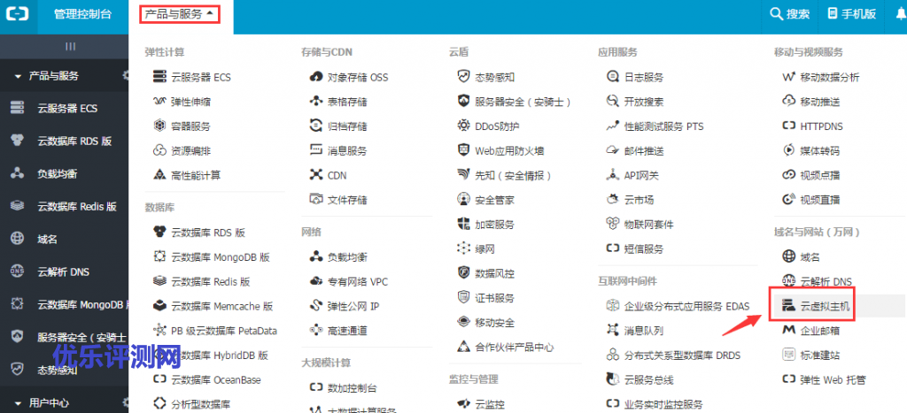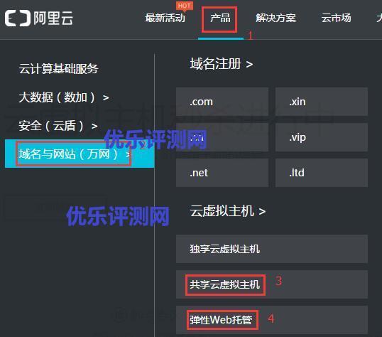 1、点击进入阿里云官网,没有账号的先注册一个账号并完成实名认证。然后导航栏点击“产品”,选择“域名与网站(万网)”栏的“共享云虚拟主机”。