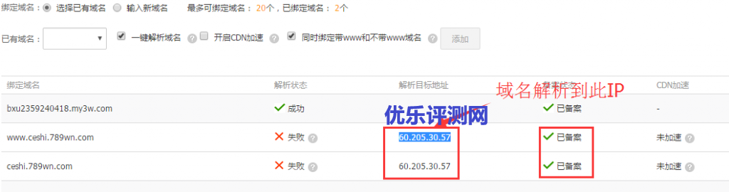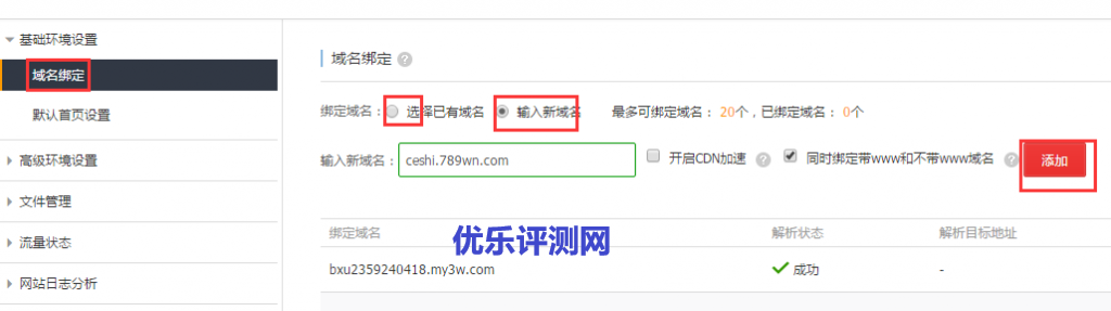 6、关于域名绑定。我们点击进入域名绑定页面。有两种方式供选择,如果勾选“选择已有域名”是指在此账号下的域名。蜗牛选择的是“输入新域名”绑定自己已经获取稳定号的域名。