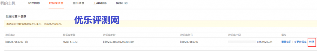 5、点击导航栏“数据库信息”可以进入到数据库管理。我们点击管理可以进入数据管理页面。