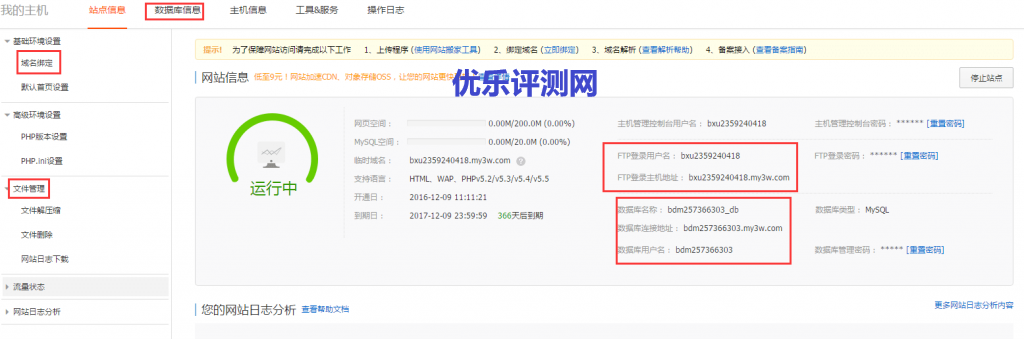 3、在主机管理面板我们可以进行文件压缩和解压已经删除站点文件。还能查看到FTP账号及地址,数据库主机地址、数据库账号、数据库名称。我们还可以在这里进行域名绑定,但是域名必须为已稳定域名。