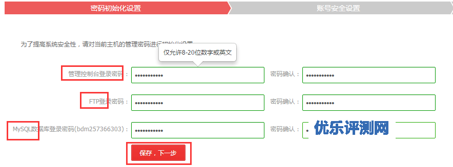 2、首次登陆需要设置管理密码、ftp密码、数据库管理密码,和绑定手机验证。