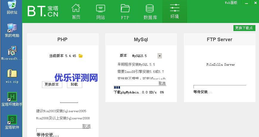 宝塔服务器管理软件是国内新起服务器管理软件,从2015年开始研发,目前逐渐走向成熟,有Windows和Linux两个版本,软件操作简单直观,通过该软件能快速创建网站和直观管理网站,完全可以零基础使用。其中Windows版本支持Windows Server 2003和Windows Server 2008系统,使用软件我们能一键安装建站所需要的IIS服务器、PHP语言环境、MYsql数据库、FTP服务器、SQL Server。