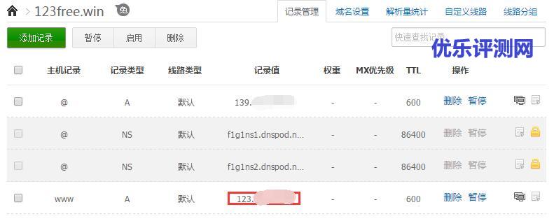 4、网站创建后到域名解析处把域名解析到你服务器的IP,如和解析域名请参照本站教程:【DNSPod】国内支持未稳定域名的免费DNS解析使用教程、【DNSzi.com】韩国免费DNS解析注册及使用教程。
