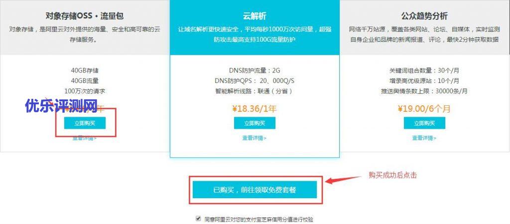 我们需要购买其中一个产品来完成芝麻信用验证。推荐购买第一个套餐,只需9元。购买后回到此页面点击”已购买,前往领取免费套餐“来完成芝麻信用验证(在购买过程中选择购买对象存储OSS时限为半年的话仅需5元)。关于购买了对象存储OSS以后如何使用,请查看【阿里云对象存储OSS】0元购价值121元的100G每年的外链储存包。芝麻信用没有达到620,无法获取体验资格的,不妨看看某宝出售的邀请码,18元一个的邀请码,可以体验长达半年的免费产品,还是很不错的,。