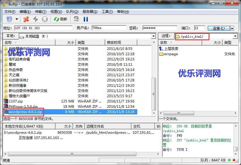 1、下载好WordPress后,这里用wordpress-4.6.1版本为例,使用FTP把wordpress-4.6.1.zip上传到你的站点空间。【FlashFXP】站点管理工具FTP使用教程