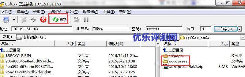 3、解压好后,再回到FTP,点击“刷新”,然后双击“wordpress”文件夹进入。