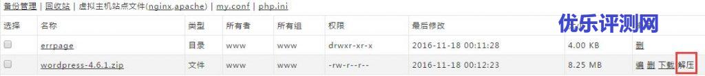2、上传好后,到你的主机管理面板,解压wordpress-4.6.1.zip。
