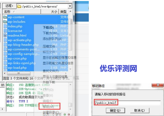 4、选择好“wordpress”文件夹里的所有文件,单击右键,选择“移动”,把文件移动到/public_html/下