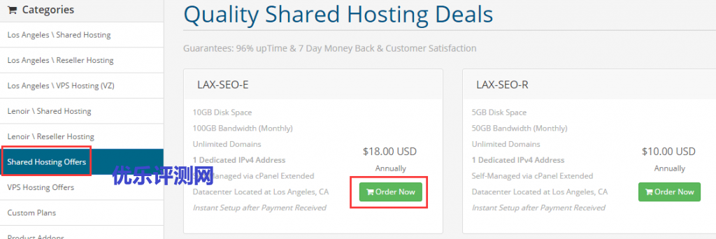 4.蜗牛789的教程选择的是Shared Hosting Offers(促销共享主机),点击即可进入到套餐选择页面,根据自己需要选择好套餐,再点击“Order Now”