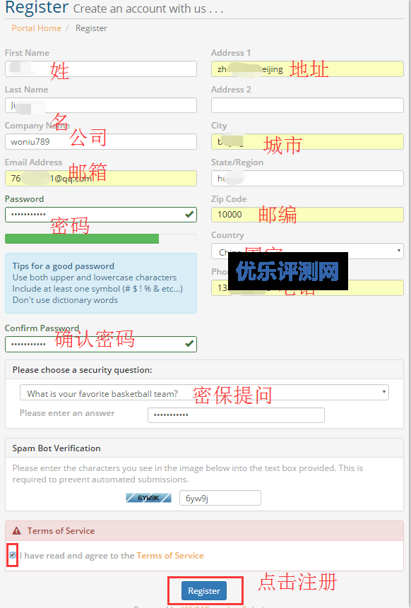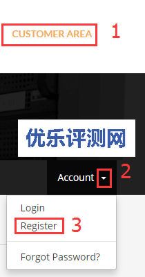1.点击进入Mirthost官网,点击导航栏“CUSTOMER AREA(客户专区)”,再点击“Account ?”中的“Register”进入到注册信息填写页面。