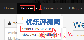 2.点击导航栏“Services(服务)”中的“Order New Services(添加新服务)”。如果你要管理自己已购买的主机,就点击“My Services(我的服务)”