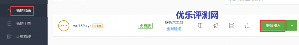 5、然后点击“我的网站”,再点击“继续接入”查看NS服务器地址