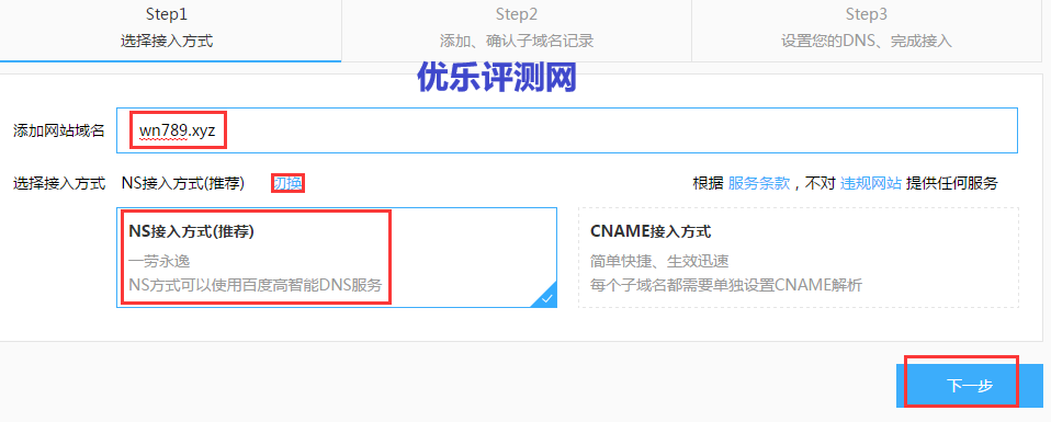 4、域名接入有NS接入和CNAME接入两种方式,我们选择NS接入,点击“下一步”。