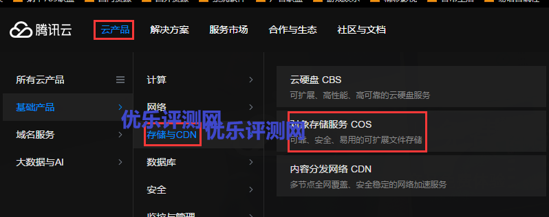 1.进入腾讯云官网后,点击导航栏的云产品,然后再在“基础产品”中找到“存储与CDN”,点击“对象存储服务COS”进入到对象存储服务页面。