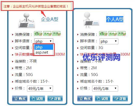 景安网络Gainet的1元购虚拟主机是国内线路主机,提供空间容量3G,数据库容量300M,连接数不限,带宽2M,流量50G,绑定域名个数15个,其实就是官方销售的国内虚拟主机中企业A型和个人A型套餐。这两个套餐原价为49元每年,2016年新注册用户可以使用优惠券减免48元,从而实现1元购买。企业A型和个人A型套餐确实很实惠,在国内很难以景安网络的价格购买这两款套餐。另外大家在选择套餐时一定要注意:1、企业版主机只允许绑定企业稳定的域名;2、脚本语言根据自己需要选择PHP或ASP。除1元购虚拟主机外,新用户还可以免费购买top顶级域名。活动详情请查看:【景安网络Gainet】新注册用户免费领top顶级域名。