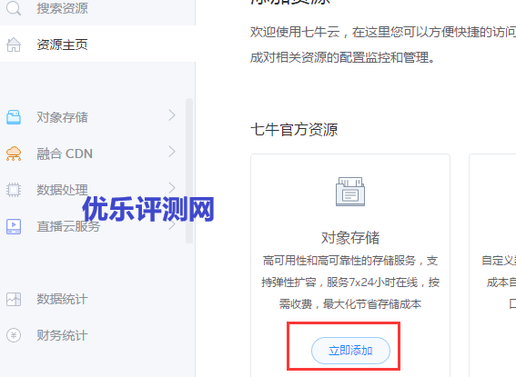 1.完成账号认证后,我们可以点击左侧的“对象存储”或右侧的“立即添加”来创建一个存储空间。