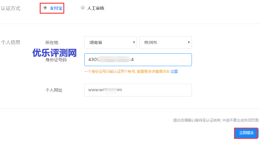 5.我们选择支付宝认证,可以快速完成认证。如果没有支付宝,那么请选择人工审核。人工审核需要自己上传身份证正反面扫描件或清晰的照片。我们的教程是选择支付宝认证。