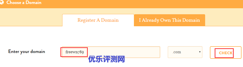 因为赠送.com域名一年,我们选择“Register Domain”注册一个域名,如果不赠送域名你想绑定自己的域名就点“I Already Own This Domain”。