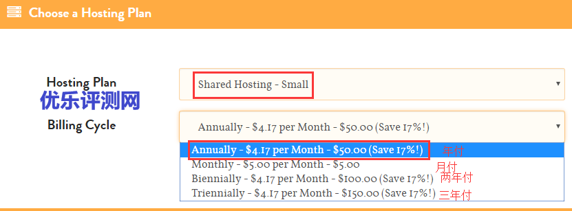 3、这里我们选择“Small”,点击“BUY NOW!”进入到购买选项和个人注册信息填写。注册信息如下图,首先是付款周期选择。