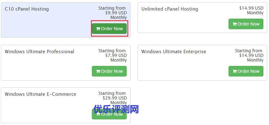 3、这里我们选择虚拟主机“Ultimate Hosting”,进入到主机套餐选择页面。根据自己需要选择好套餐,教程选择的是“C10 cPanel Hosting”,点击“Order Now”。