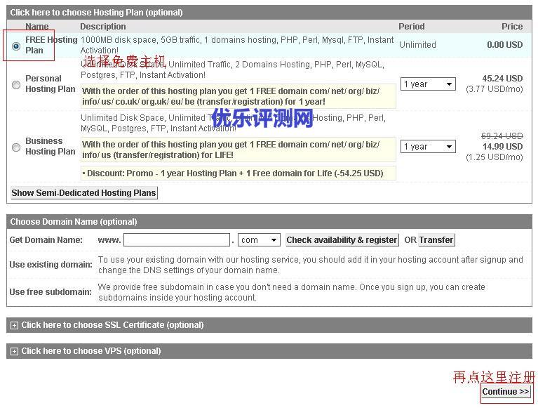 2、选择”FREE Hosting Plan“免费主机,点击”Continue“进入到注册信息填写页面。