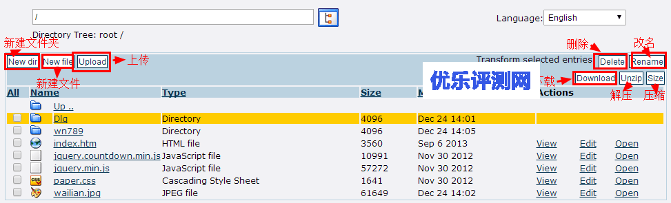 6、点击”File Manager“进入到在线文件管理。下图为在线文件管理的相应功能介绍: