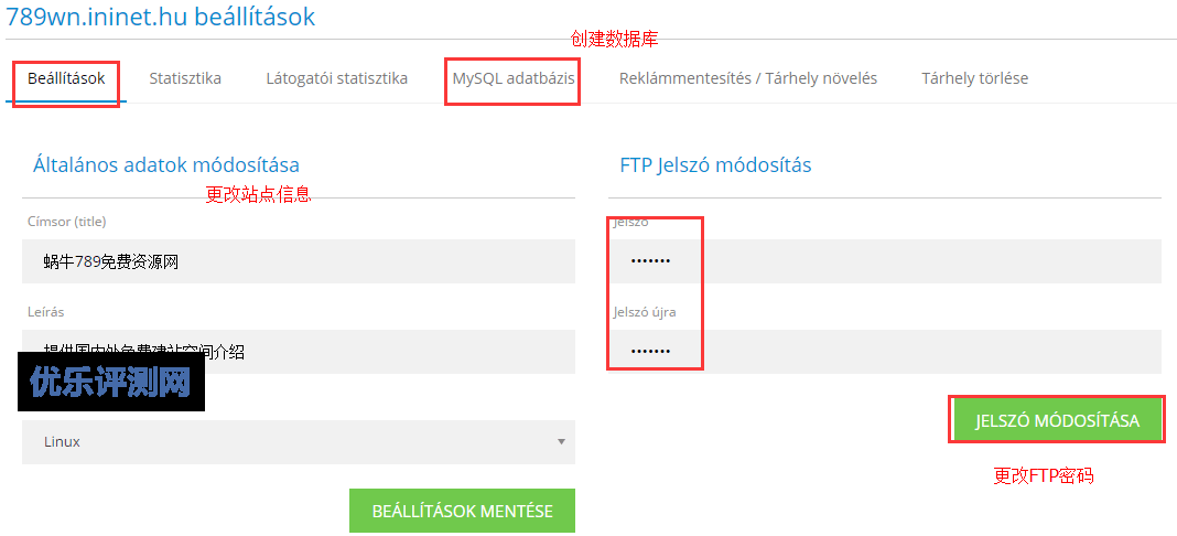 9、然后点击“Beállítások”进入到设置页面,我们可以在这里更改站点信息和修改FTP密码。