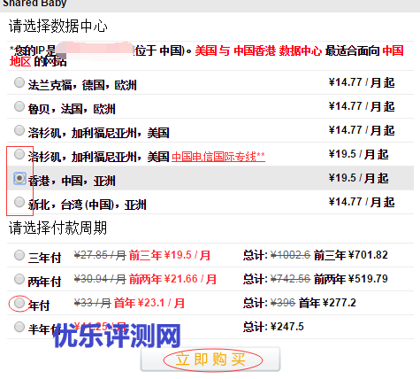 下面就是主机线路选择页面,如果针对欧洲用户就选择法兰克福和鲁贝。如果你的网站主要访问用户是国内用户建议选择洛杉矶中国电信专线、香港、新北线路,蜗牛推荐使用香港和新北线路。关于付款周期,建议使用年付,毕竟年付经常有优惠活动,基本每月都有。你可以在这里获取最新优惠码:最新【Sugarhosts糖果主机】普通虚拟主机购买优惠码