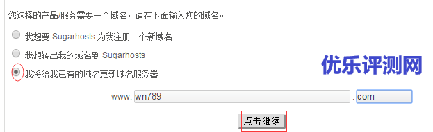 选择好主机线路及购买周期后,点击“立即购买”进入到了产品配置页面,需要你填写自己的域名或者注册一个域名。建议大家不要购买Sugarhosts的域名,太贵!!!我们选择绑定自己域名即可。如果没有域名,可以到本站免费域名板块查看相应文章选择免费域名或比较实惠的域名。