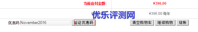 这一步进入到了订单总额页面,一般使用本站链接会自动填写上优惠码,如果没有自动填写,请在优惠码后面填写上当前可以使用的优惠码,然后点击“验证优惠码”。如果优惠码可以使用,你的当前应付金额会发生变化。然后点击“结账”进入到付款页面。