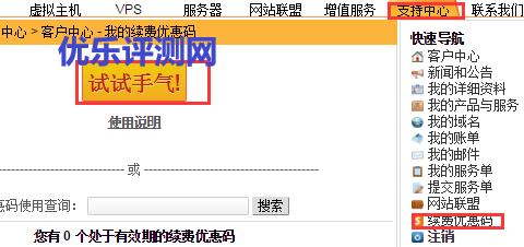 登录自己账户后,点击“支持中心”,然后再快速导航栏里选择“续费优惠码”。再点击“试试手气”。就可以抽取。